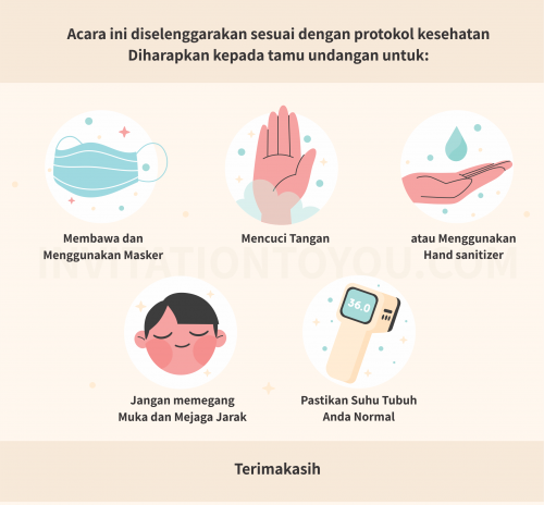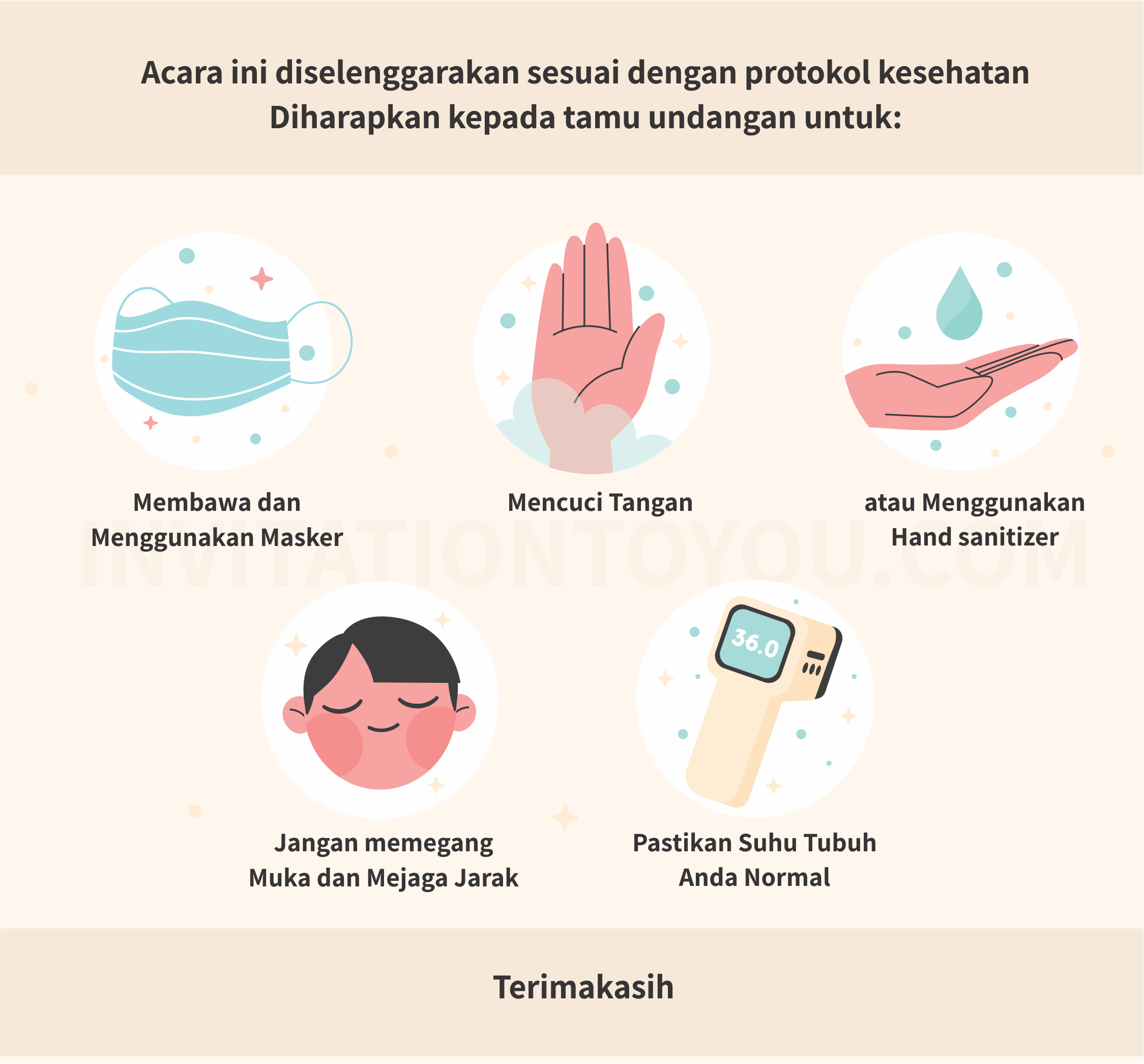 Pernikahan kami akan diselenggarakan dengan memperhatikan protokol kesehatan dan jumlah tamu undangan yang terbatas setiap sesinya, karena kondisi pandemi. Oleh karena itu, kami menyarankan tamu undangan untuk mengikuti protokol kesehatan sebelum memasuki lokasi akad & resepsi. Kami sangat menghargai dukungan dan do’anya.